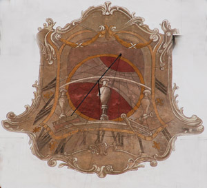 :: DESCRIPCIÓ: Vertical força declinant de matí, línies horàries, marques a les mitges hores, línies zodiacals, números romans (de VI a III), gnòmon (1 mt) recolzat i amb bola al mig