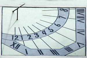 :: DESCRIPCIÓ: Vertical rectangular, declinant de tarda, línies horàries, doble numeració (de 12 a 8) i (de XII a VIII), gnòmon (50 cms) recolzat