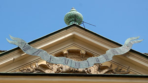 :: DESCRIPCIÓ: Vertical de tarda, forma part de la decoració barroca del pati del palau, antic convent, sense línies, números romans (de VIII a V) en una banda metàl·lica, gnòmon (1 mt) recolzat