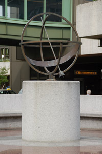 :: DESCRIPCIÓ: Esfera equatorial situat en una base cilíndrica, línies horàries, números romans (de VI a VI), gnòmon (1 mt) fletxat, simula l''eix de la Terra