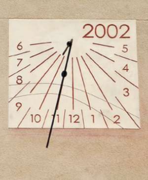 :: DESCRIPCIÓ: Gravat damunt placa de marbre. Línies horàries nums àrabs (de 6 a 5), senyala també les mitges hores. Té corbes de declinació solar, gnòmon (30 cms) vareta amb bola al mig per marcar el calendari