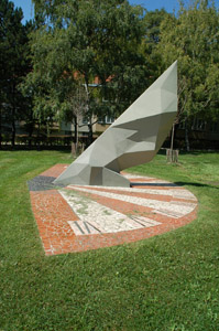 :: DESCRIPCIÓ: Fet de trencadís de ceràmica, franges de colors blanc i taronja marquen les línies horàries, situat al mig d'un jardí comunitari, números romans (de VI a VI), gnòmon (4 mts) artístic