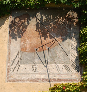 :: DESCRIPCIÓ: Vertical molt declinant de tarda, mig tapat per les enfiladisses del jardí, línies horàries fletxades, punts a les mitges hores, números romans (de X a VIII), gnòmon (120 cms) doble recolzament