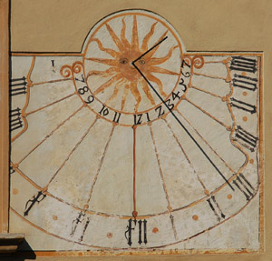 :: DESCRIPCIÓ: Vertical de tarda, línies horàries, punts a les mitges hores, dobles numeració, aràbiga (de 7a 7) i gòtica (de VII a VII) ambdues en corona, gnòmon (40 cms) orto