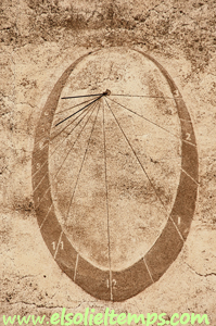 :: DESCRIPCIÓ: Vertical ovalat, força declinant de matí, línies horàries i mitges hores més curtes, números àrabs (de 6 a 3) en corona, gnòmon (30 cms) vareta, elevació 440 mts. snm.