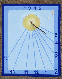 :: DESCRIPCIÓ: Vertical lleugerament declinant de tarda, línies horàries, números àrabs (de 9 a 5) en marc, gnòmon (50 cms) vareta, tort, datat