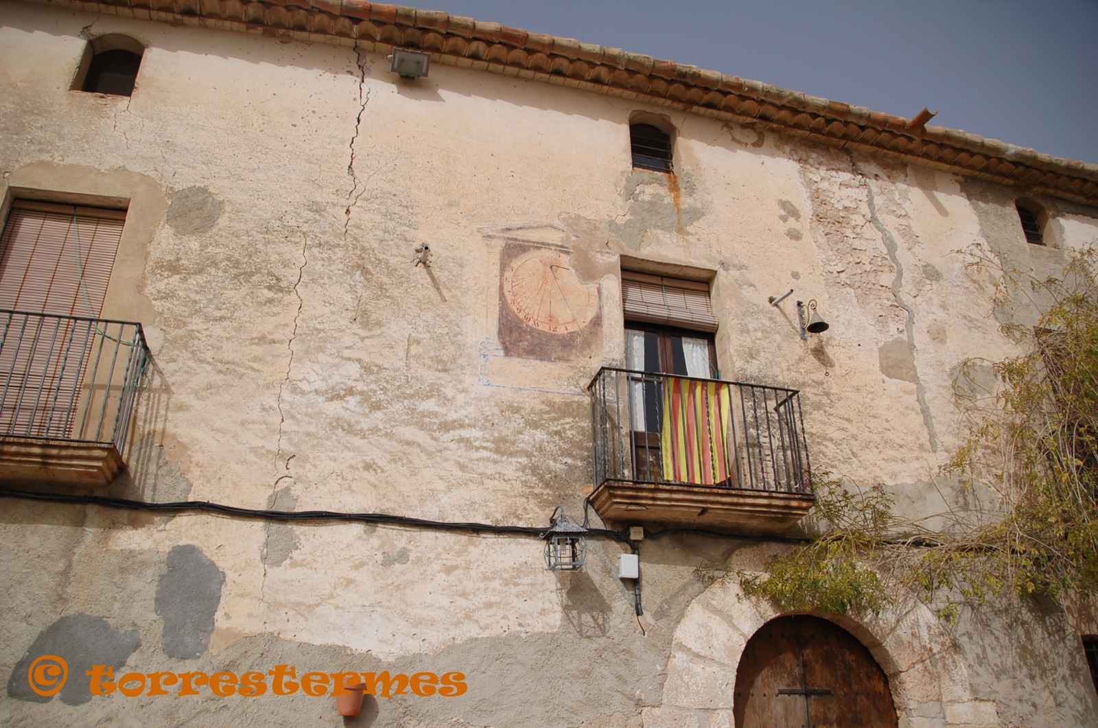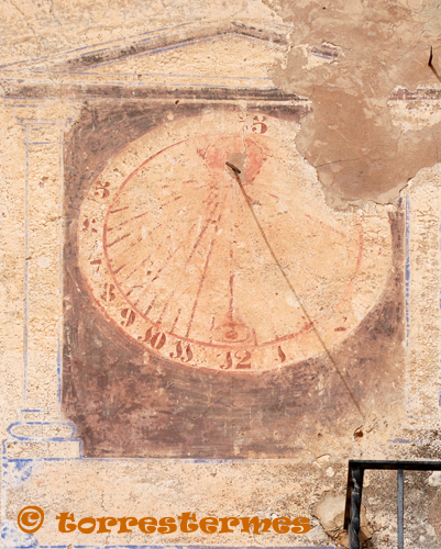 :: DESCRIPCIÓ: Vertical circular, orientat a llevant, línies horàries i mitges hores més curtes, números àrabs (de 5 a 3) en corona, gnòmon (30 cms.) vareta, elevació 380 mts.