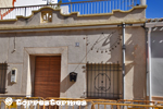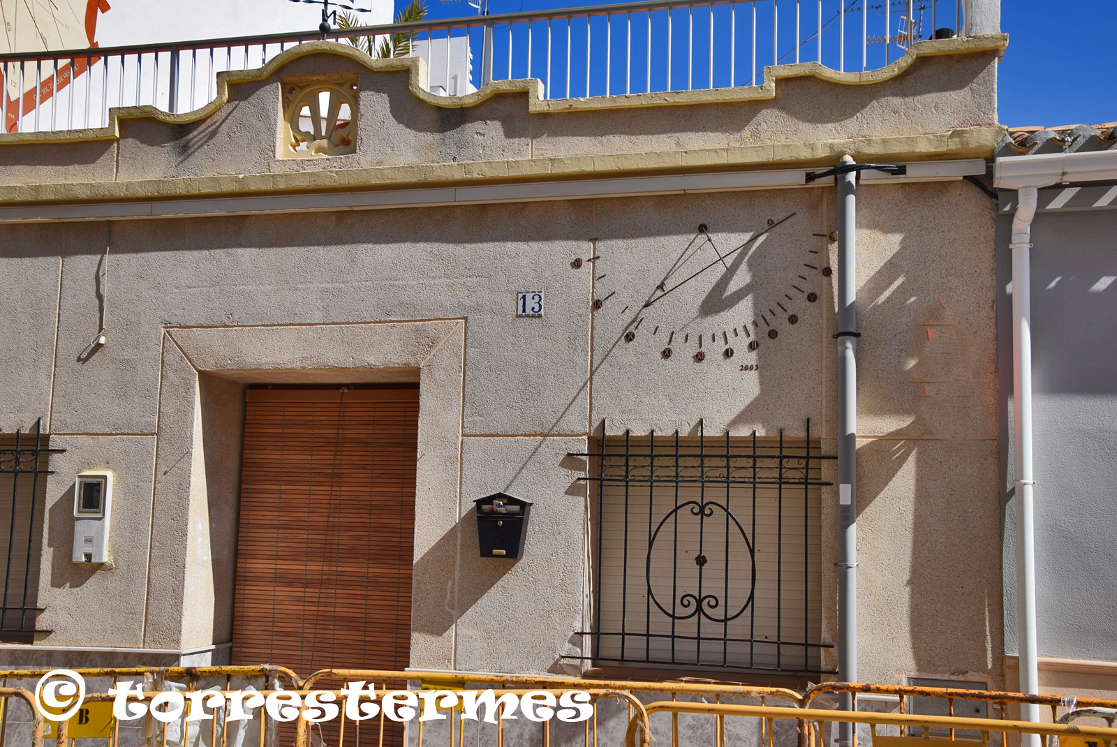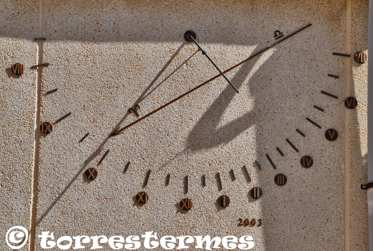:: DESCRIPCIÓ: Vertical de tarda, construït amb peces de metall enganxades a la paret, línies horàries i mitges hores molt curtes, línia equatorial, números romans (de VIII a VII) sobre discs metàl·lics, gnòmon (50 cms) bola al mig i recolzat, elevació 20 mts. snm.