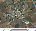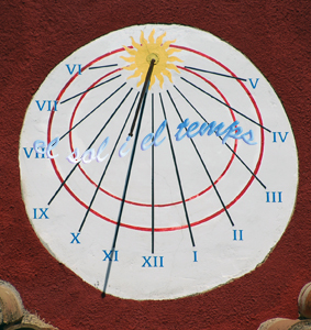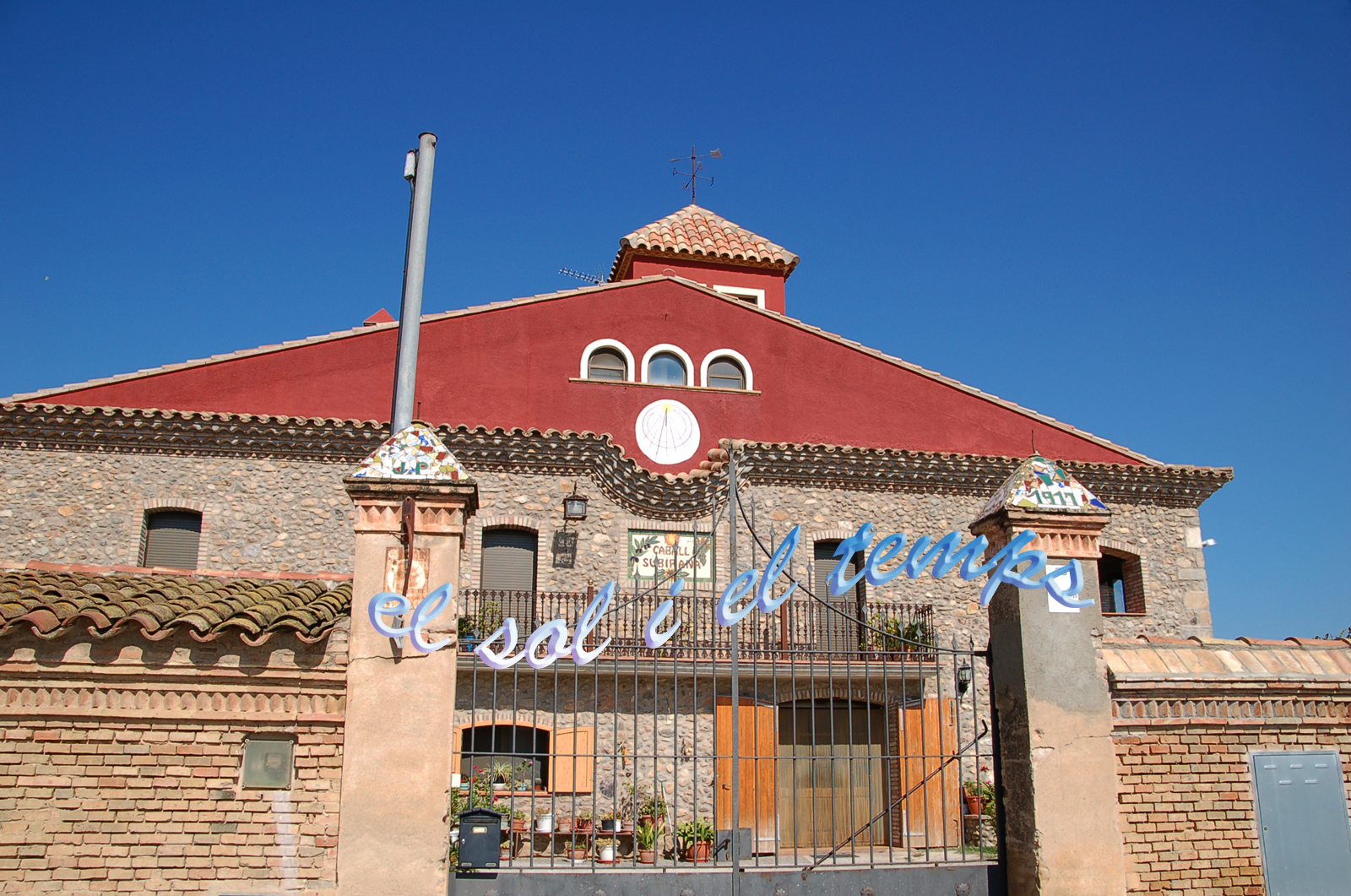 :: DESCRIPCIÓ: Vertical circular, lleugerament de matí, línies horàries, números romans (de VI a V), gnòmon (40 cms) acabat en bola, elevació (43 mts)