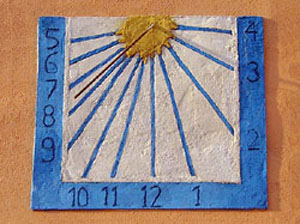 :: DESCRIPCIÓ: Rectangular, amb sanefa a tres dels costats on hi ha les xifres aràbigues que senyalen de 5 a 4, línies horàries i un sol en relleu al pol d'on surt el gnòmon de vareta metàl·lica.