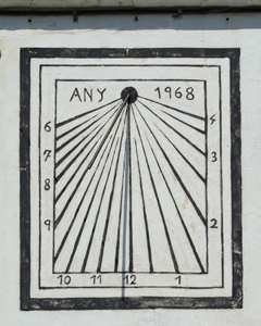 :: DESCRIPCIÓ: Rectangular enmarcat per una cinta de color negra, a l'interior un altre doble enmarcament on hi ha la numeració aràbiga marcant de 6 a 4. Línies per les hores i les mitges hores. Molt auster.