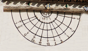 :: DESCRIPCIÓ: Rudimentari rellotge semicircular meridional, quatre cercles concèntrics, línies horàries fletxades, números àrabs (de 7 a 5), gnòmon substituït per un ferro (20 cms) acabat en anella, datat