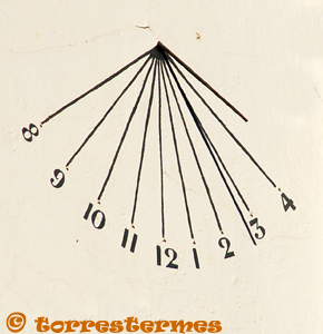 :: DESCRIPCIÓ: Vertical meridional, pintat sobre la façana, línies horàries, números àrabs (de 8 a 4), gnòmon (30 cms) vareta, elevació 441 mts. snm.