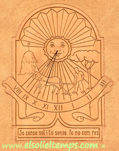 :: DESCRIPCIÓ: Vertical de matí, línies horàries i mitges hores, números romans (de VIII a III), gnòmon (30 cms) polar, decorat amb una escena rural d'un pagès llaurant, lema, elevació 30 mts. snm.