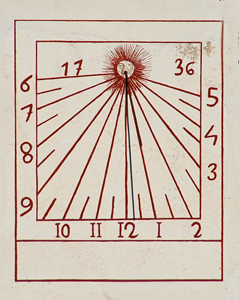 :: DESCRIPCIÓ: Vertical poc declinant de matí, línies horàries i mitges hores més curtes, números àrabs (de 6 a 5) en marc, gnòmon (40 cms) polar, datat