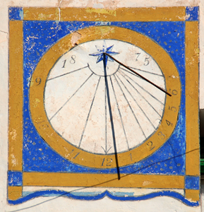 :: DESCRIPCIÓ: Vertical circular dins una decoració quadrada, declinant de tarda, línies horàries la de les 12 fletxada, números àrabs (de 9 a 7), gnòmon (60 cms) polar, datat
