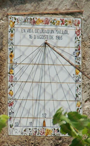 :: DESCRIPCIÓ: Composició vertical de rajoles (6x7), de matí, línies horàries i mitges hores més curtes, campana a migdia, números àrabs (de 7 a 4), gnòmon (50 cms) vareta, datat