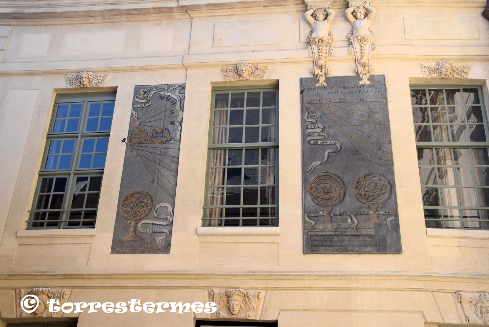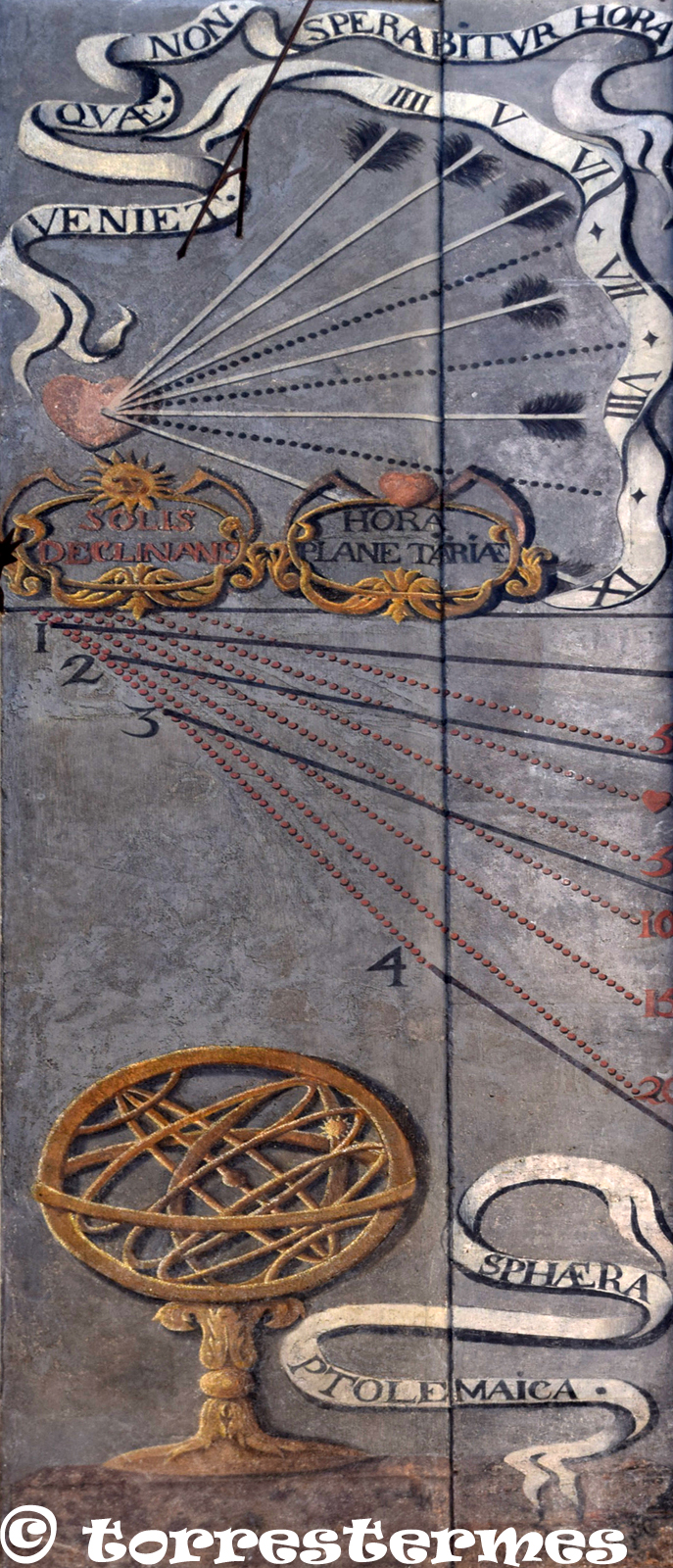 :: DESCRIPCIÓ: Conjunt de 7 rellotges distribuït en 4 panells en el pati principal de l’edifici. 2nd.: Dona la declinació del sol en la seva evolució de 5º en 5º, de 0º (equatorial) a 23º5' (solstici d’estiu). Hores planetàries en números àrabs, elevació 46 mts.