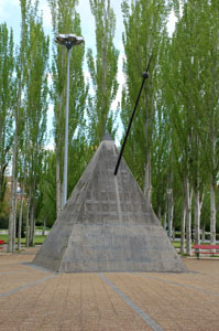 :: DESCRIPCIÓ: Piràmide de gran tamany, situada al mig d'una plaça publica del barri, línies horàries, números romans (de VI a VI), gnòmon (8 mts) amb bola al mig