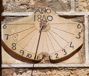 :: DESCRIPCIÓ: Vertical semicircular, meridional, línies horàries, números àrabs (de 6 a 6) en corona, gnòmon (15 cms) vareta, datat