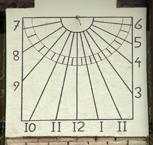 :: DESCRIPCIÓ: Vertical lleugerament de tarda, línies horàries i marques curtes a les mitges hores, números àrabs (de 7 a 6 - la grafia del 2 es II), gnòmon (15 cms) vareta