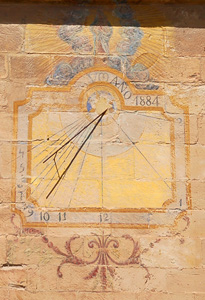 :: DESCRIPCIÓ: Vertical força declinant de matí, línies horàries, números àrabs (de 4 a 3), gnòmon (50 cms) recolzat, datat i signat, molt decorat