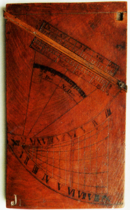 :: DESCRIPCIÓ: Rellotge de sol caputxí, línies horàries, mitges hores i quarts, numeració romana doble. El nom l'agafa de la forma de caputxa de monjo que te el gràfic horari