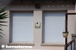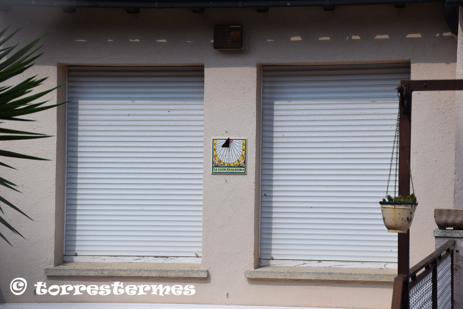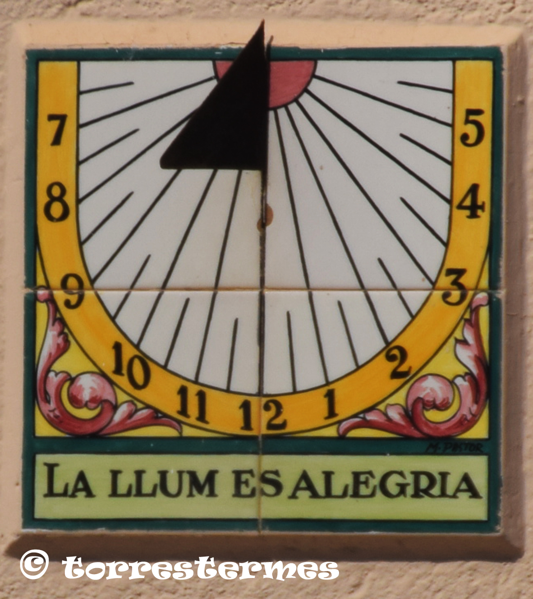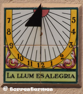 :: DESCRIPCIÓ: Composició de rajoles de ceràmica (2x2) vertical de matí, línies horàries i mitges hores més curtes, números àrabs (de 7 a 5) en corona, gnòmon (10 cms) triangular, signat, elevació 288 mts. snm.
