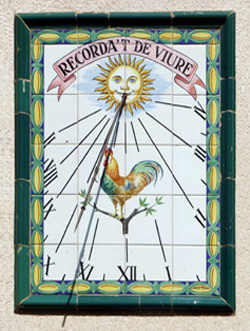 :: DESCRIPCIÓ: Composició de rajoles de ceràmica (4x5) vertical de matí, línies horàries i marques a les mitges hores, números romans (de VII a IV, la grafia del primer es II), gnòmon (40 cms) fletxat, signat