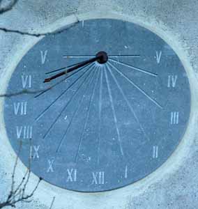 :: DESCRIPCIÓ: Circular vertical de matí, gravat a la pedra, línies horàries, números romans (de V a V), gnòmon (60 cms) fletxat