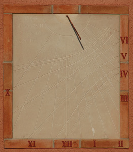 :: DESCRIPCIÓ: Vertical declinant de tarda, línies horàries i mitges hores, línies zodiacals, analema a les 12, números romans (de X a VI), gnòmon (30 cms) vareta, datat