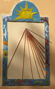 :: DESCRIPCIÓ: Vertical, força declinant de matí, línies horàries, sense numeració, decorat amb motius de flora i fauna, gnòmon (50 cms) vareta