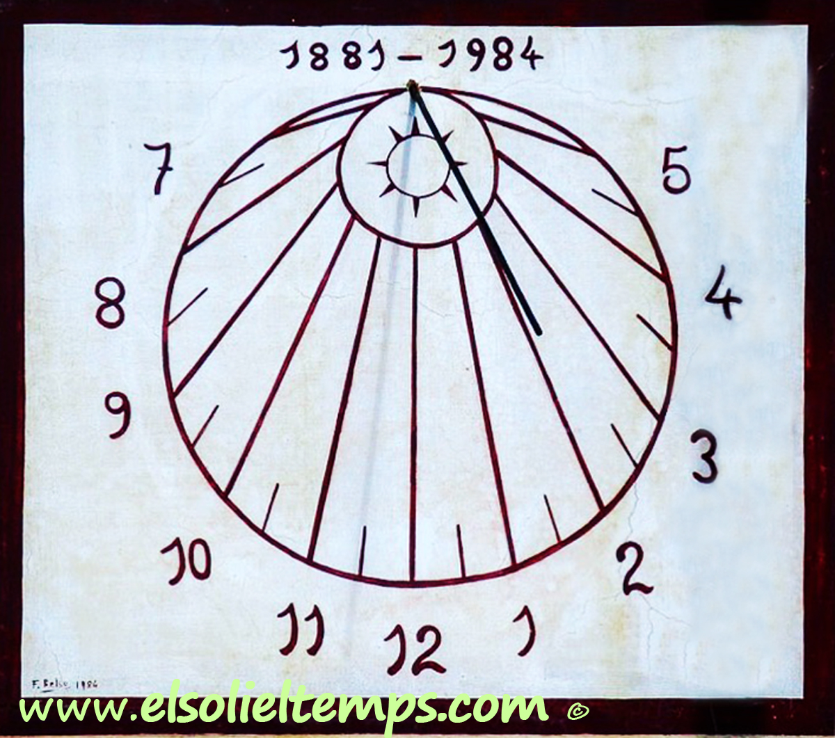 :: DESCRIPCIÓ: Vertical de tarda, circular dins un quadrat, línies horàries i mitges hores més curtes, números àrabs (de 7 a 6) en corona, gnòmon (60 cms) vareta, signat i datat, elevació 158 mts. snm.