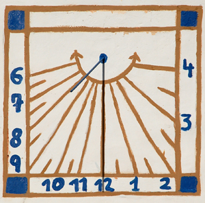 :: DESCRIPCIÓ: Vertical de matí, línies horàries i marques a les mitges hores, números àrabs (de 6 a 4) en marc, gnòmon (50 cms) vareta