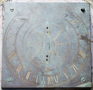 :: DESCRIPCIÓ: Horitzontal, quadrat, sobre pedestal de fusta, gravat circular, d'estil angles, marques a les hores i mitges hores, números romans (de VI a VI), gnòmon absent