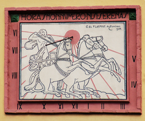 :: DESCRIPCIÓ: Vertical meridional, decorat amb una quadriga, línies horàries, números romans (de VI a V), gnòmon (80 cms) vareta, signat i datat
