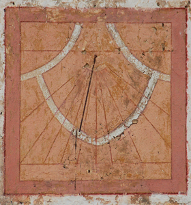 :: DESCRIPCIÓ: Vertical meridional quadrat, línies horàries, sense numeració, gnòmon (50 cms) vareta