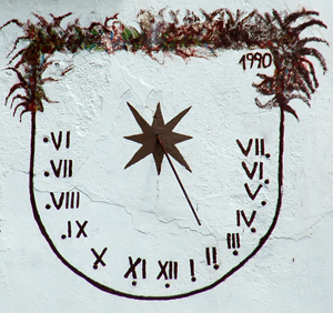 :: DESCRIPCIÓ: Vertical de tarda, en forma d'escut, sense línies punts a les hores, números romans (de VI a VII), gnòmon (40 cms) vareta, datat