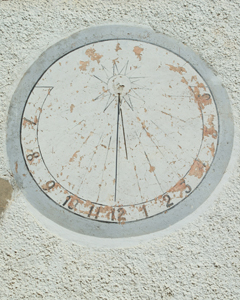 :: DESCRIPCIÓ: Circular, presidit per un sol-estrella d'on surt el gnòmon. Te línies horàries i numeració aràbica; marca de 6 del matí a de la tarda.