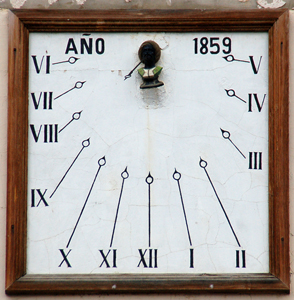 :: DESCRIPCIÓ: Vertical de mati, línies horàries fletxades inverses, números romans (de VI a V), gnòmon (15 cms) vareta, surt de la boca d'un bust humà, datat