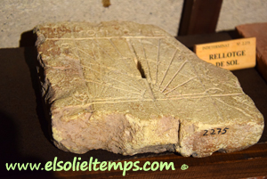 :: DESCRIPCIÓ: Rellotge de balcó, rectangular, gravat sobre pedra, línies horàries, numeració aràbiga (de 6 a 6), gnòmon absent, elevació 461 mts. snm..