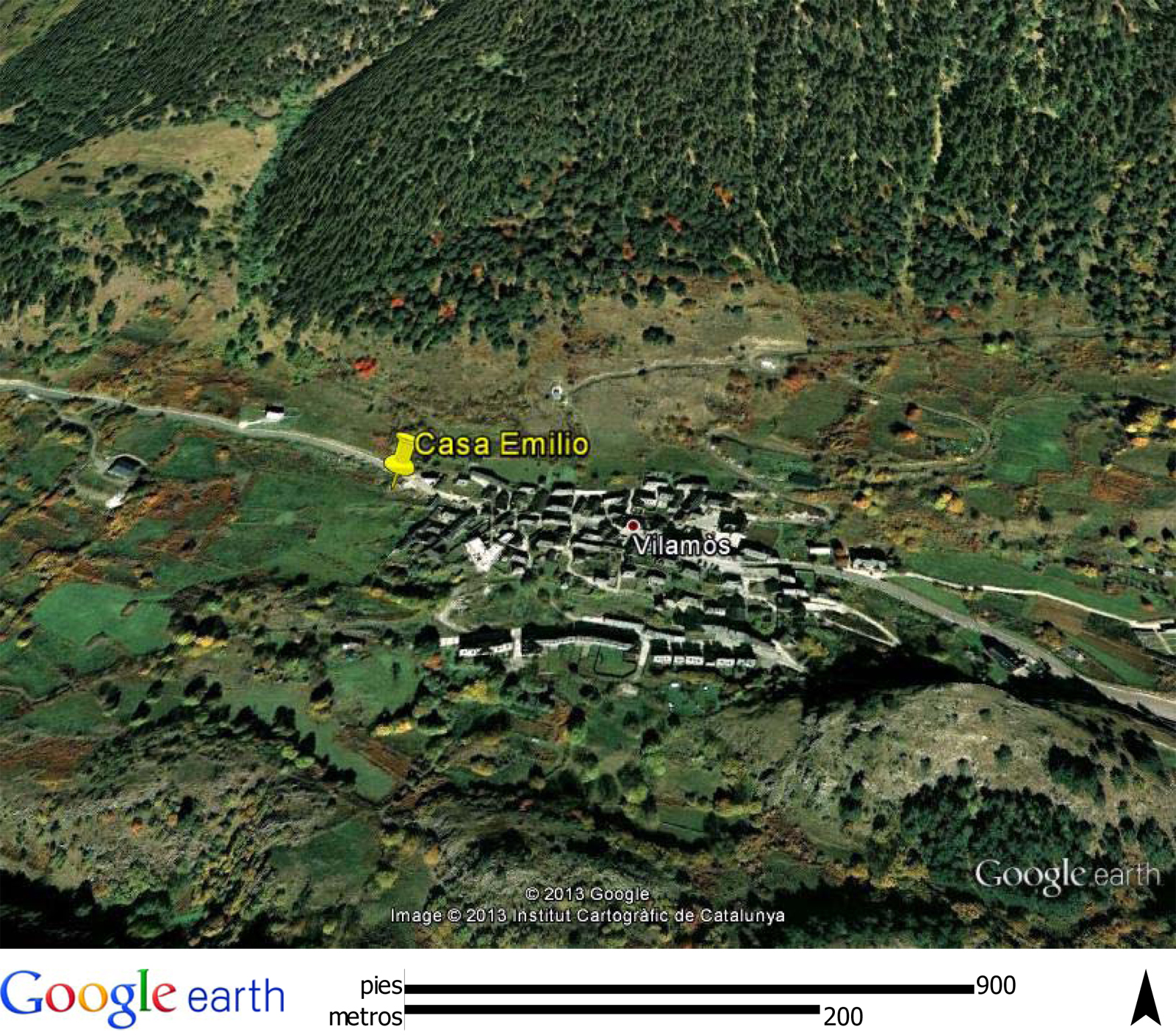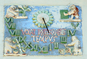 :: DESCRIPCIÓ: Rectangular vertical de sèrie, colorejat, sense línies, números romans (de VI a IV), mal situat (la paret declina a ponent), gnòmon (25 cms) vareta