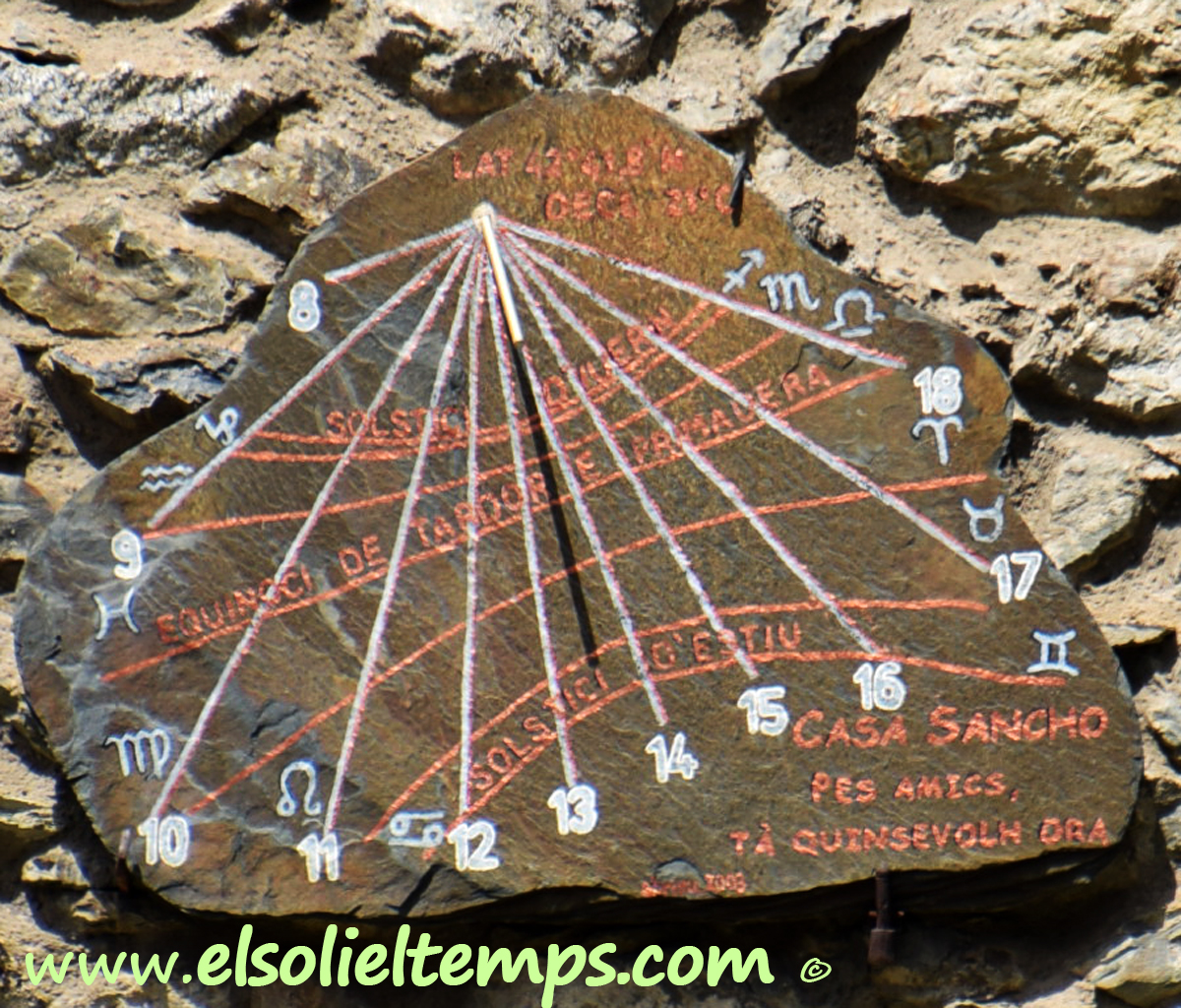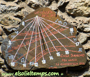 :: DESCRIPCIÓ: Vertical de tarda, de forma irregular aprofitant la forma de la llosa on està fet, línies horàries, zodiacals, solsticis i equinoccis, números àrabs (de 8 a 18), gnòmon (15 cms) vareta, signat i datat, lema, elevació 1008 mts. snm.