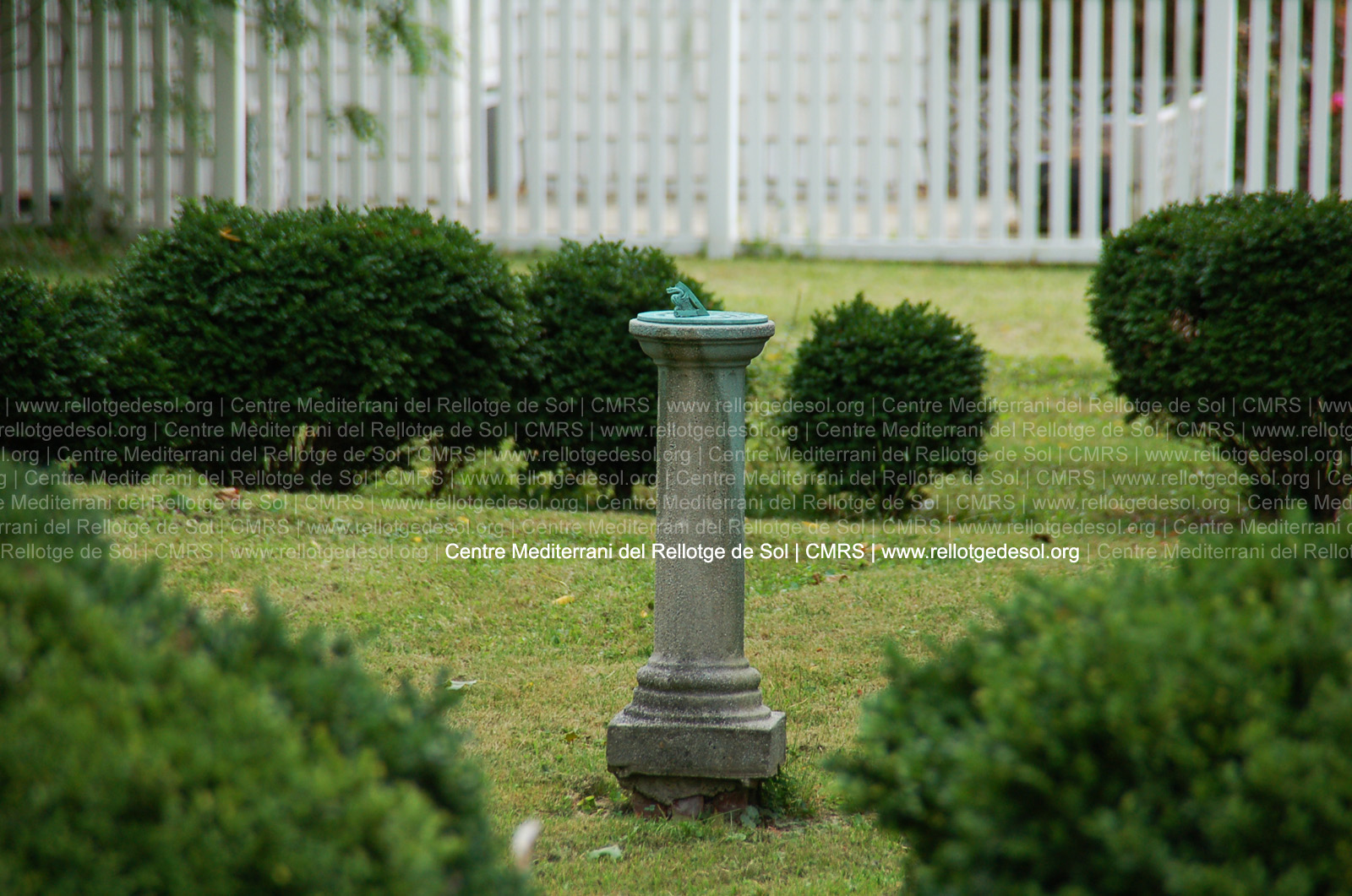:: DESCRIPCIÓ: Horitzontal circular, sobre peu de pedra, línies horàries, mitges hores i quarts, números romans (de V a VII), gnòmon (10 cms) triangular i tort