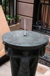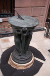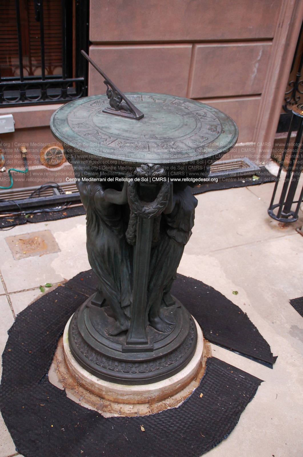 :: DESCRIPCIÓ: Horitzontal circular, sobre peu de bronze, línies horàries, signes del zodíac, números romans (de VI a VI), gnòmon (20 cms) triangular troquelat