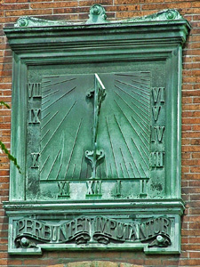 :: DESCRIPCIÓ: Vertical de tarda, gravat en una placa de bronze, línies horàries, mitges hores i quarts, més curtes, números romans (de VIII a VI), gnòmon (70 cms) triangular troquelat, lema