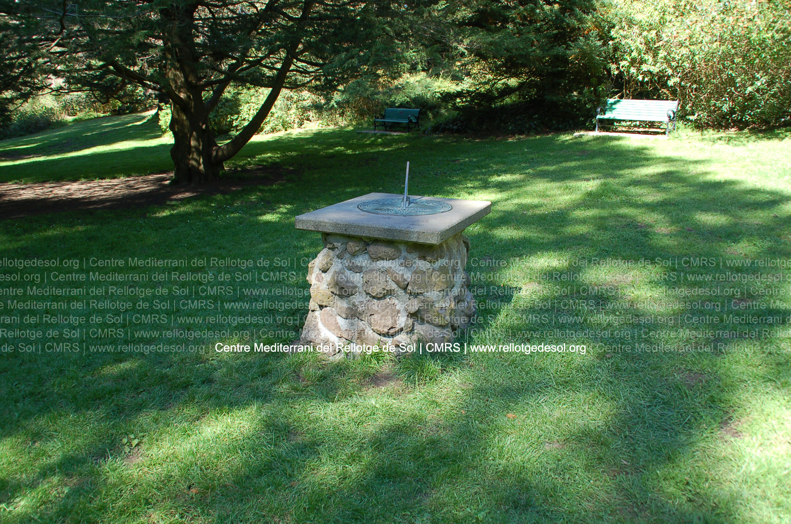 :: DESCRIPCIÓ: Horitzontal circular de bronze, línies horàries curtes, números romans (de V a VII) en corona, gnòmon (40 cms) triangular, datat, lema