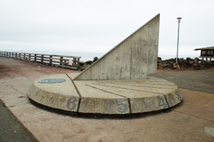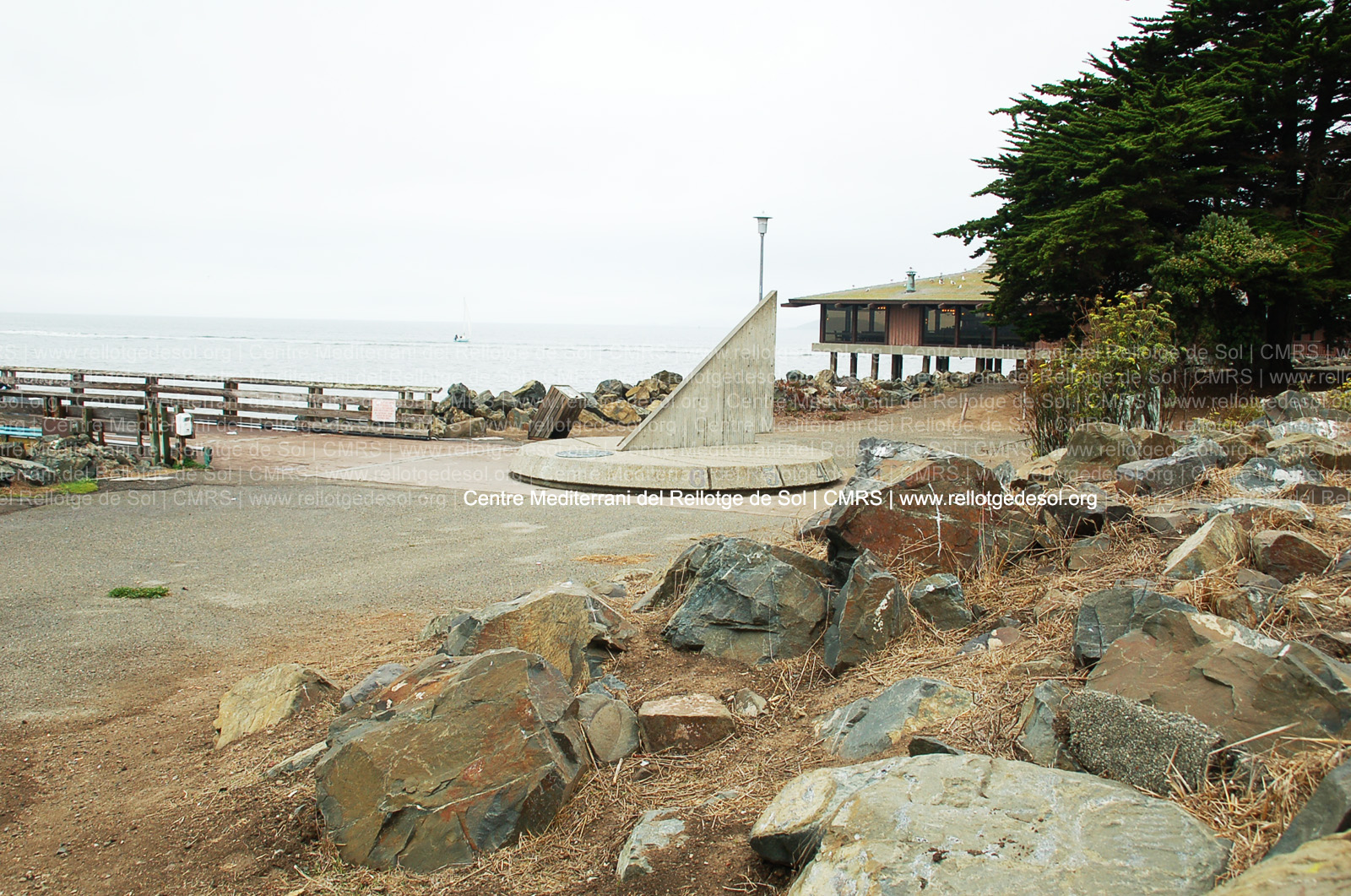 :: DESCRIPCIÓ: Horitzontal circular, línies horàries, números àrabs (de 6 a 6) al lateral, gnòmon (2,5 mts) triangular, datat