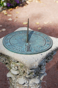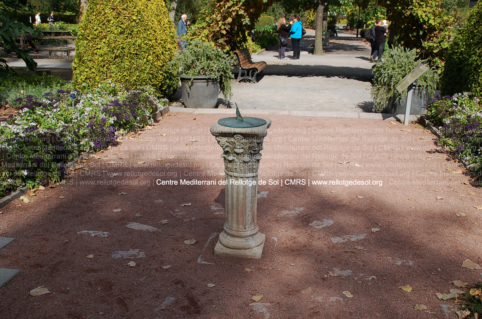 :: DESCRIPCIÓ: Horitzontal circular, sobre un peu de pedra, línies horàries, mitges hores i quarts, números romans (de VI a VI), gnòmon (10 cms) triangular troquelat en forma d'ocell
