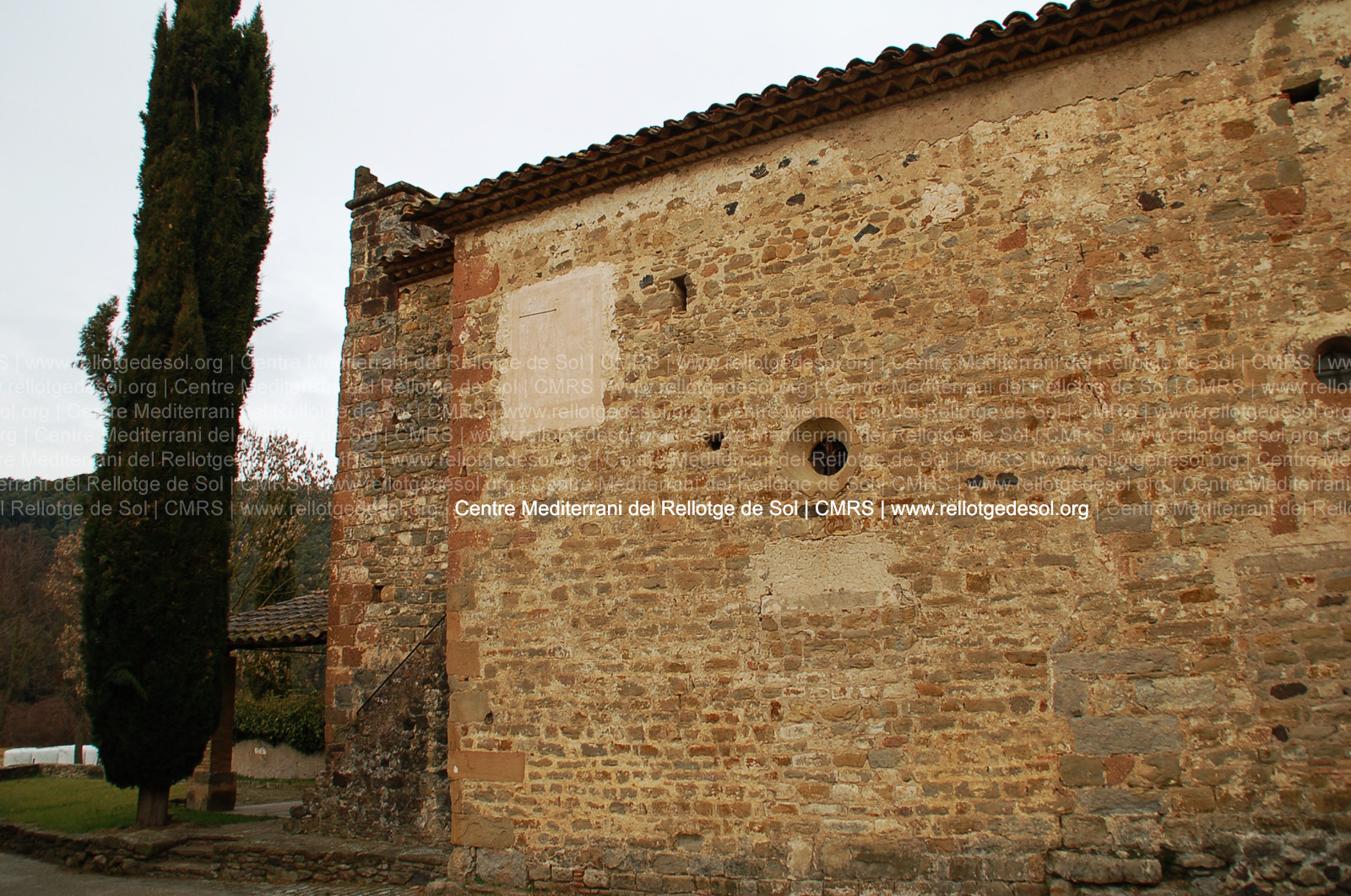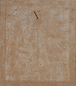 :: DESCRIPCIÓ: Vertical de mati, força malmès, s'endevinen restes de línies horàries i numeració aràbiga, gnòmon (35 cms) acabat en bola, tort, alçada s.n.m. 581 mts